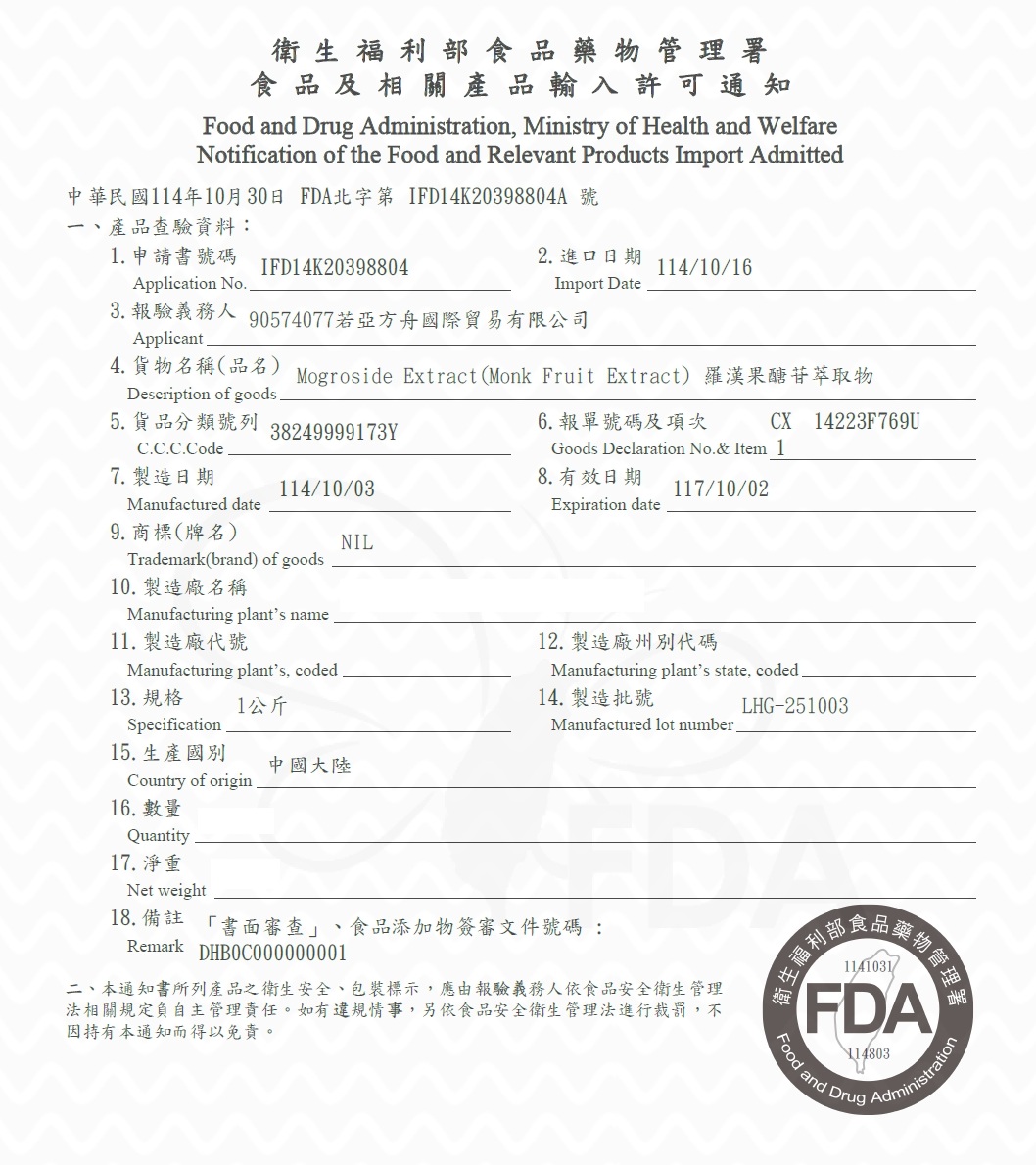 首頁 > 最新消息 > 羅漢果醣苷萃取物 中國 食品及相關產品輸入許可