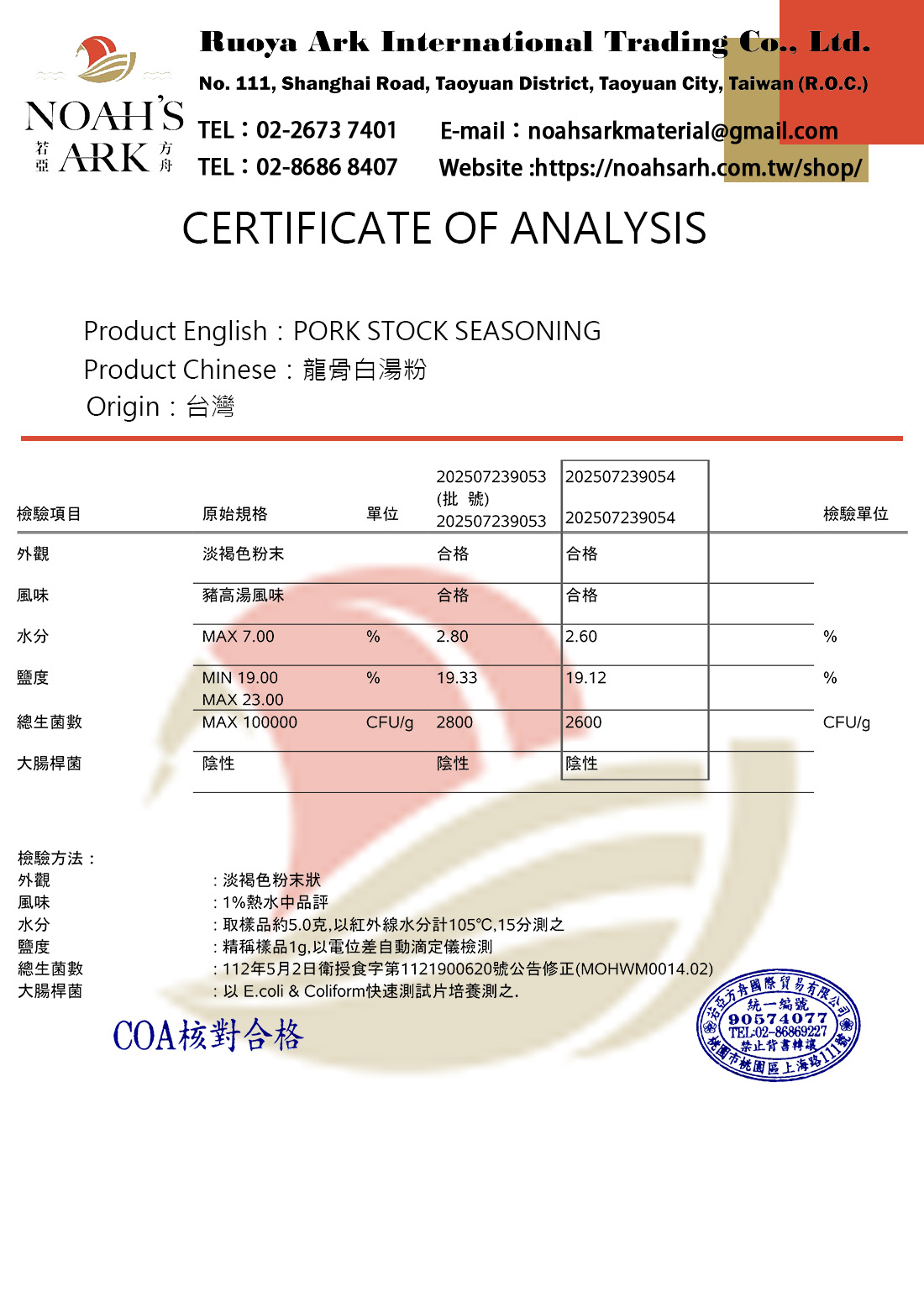成分:豬肉抽出物、奶精粉、食鹽L-麩酸鈉、雞肉抽出物、黄豆水解蛋白、豬油、豬骨抽出物、乳糖、5’-次黃嘌呤核苷磷酸二鈉、5’-鳥嘌呤核苷磷酸二鈉、中鏈三酸甘油酯、琥珀酸二鈉、洋蔥蒜頭、香料(香料、丁基羥基甲氧苯(抗氧化劑)、中鏈三酸甘油酯、糊精、辛烯基丁二酸鈉澱粉)、胺基乙酸、L-天門冬酸鈉、DL-胺基丙酸