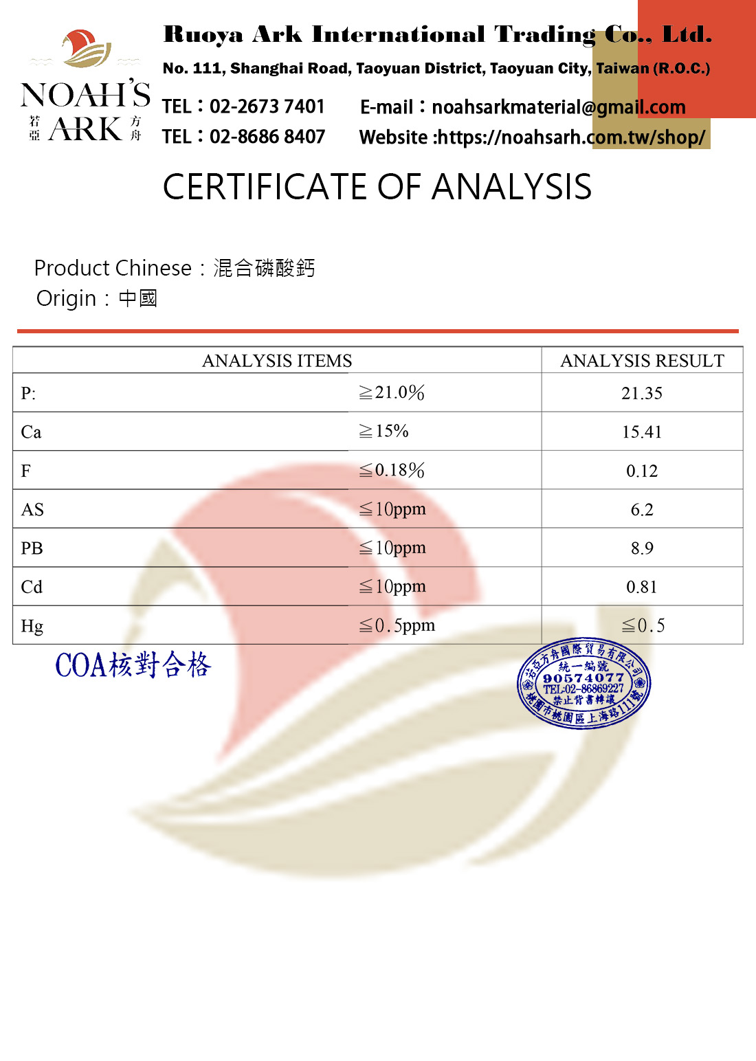 粉塵少,減少物料損失,改善飼料工廠操作環境,流動性佳,與其他飼料原料易於混合均勻,呈弱酸性,磷鈣比率適當,可改善飼料之適口性與提高磷鈣之生物利用。