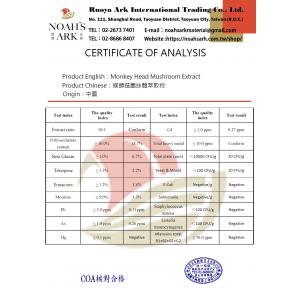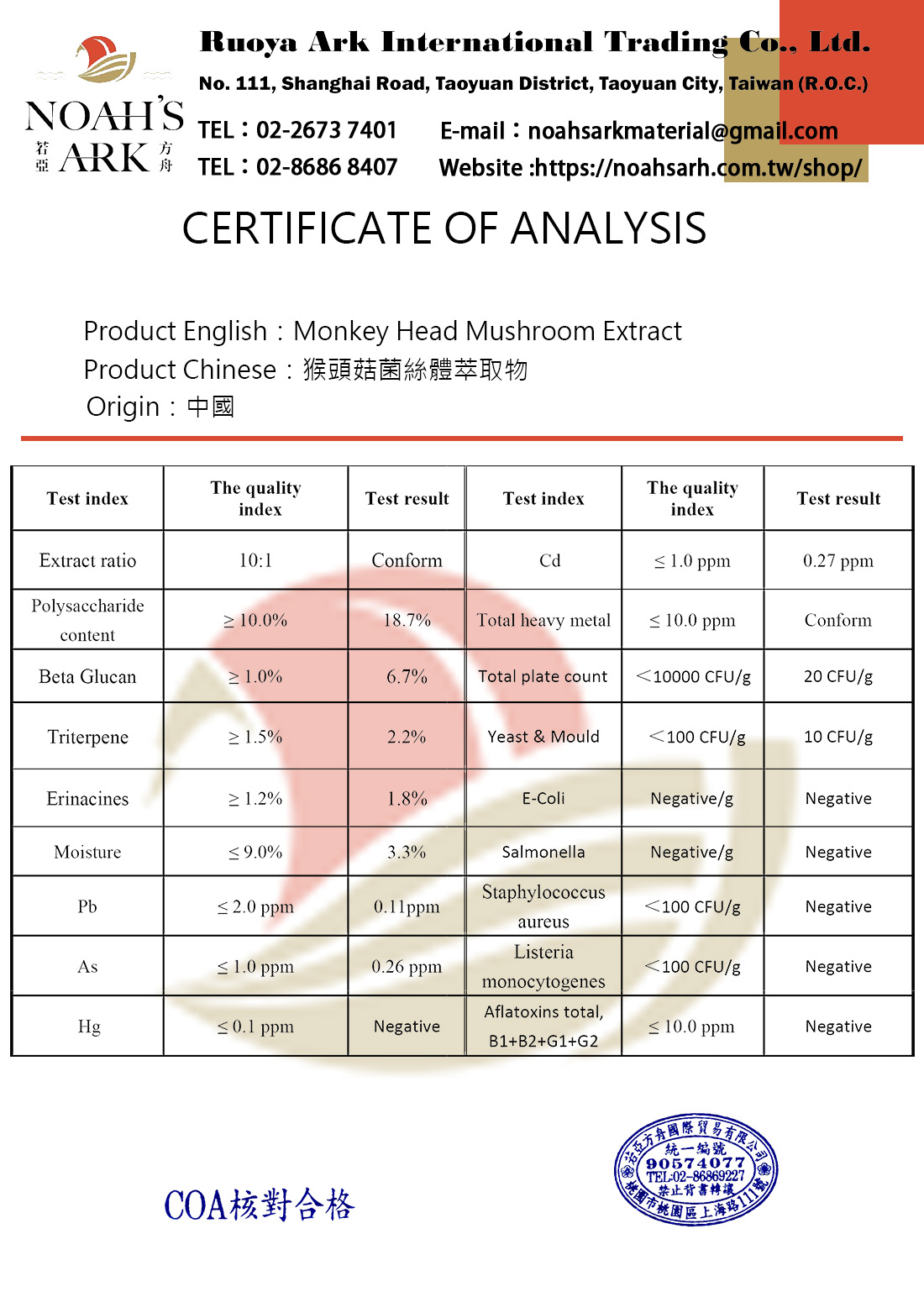 規格:Polysaccharide(多醣體) ≧ 10%、Beta glucan(β-聚葡萄糖) ≧ 1.0%、Erinacines(猴頭素) ≧ 1.2%、Triterpene(三萜類) ≧ 1.5%