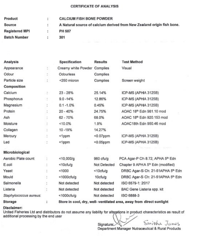 於紐西蘭的專用工廠中生產製造,使用酵素水解+非鍛燒灰化,完整製程中溫度皆控制<100℃,以保留魚骨粉本身含有鈣以外的礦物質及膠原蛋白。