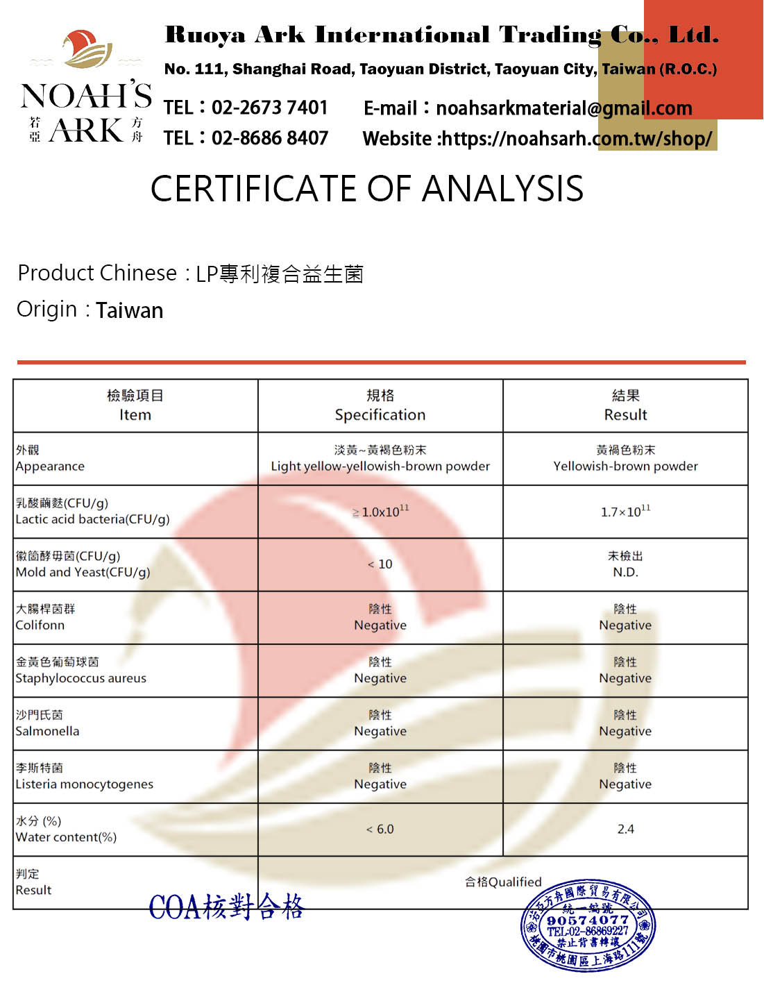 品名:LP專利複合益生菌(含 LP115、LA25、LF26、LRH10、LPC12、LDL114) 食品級