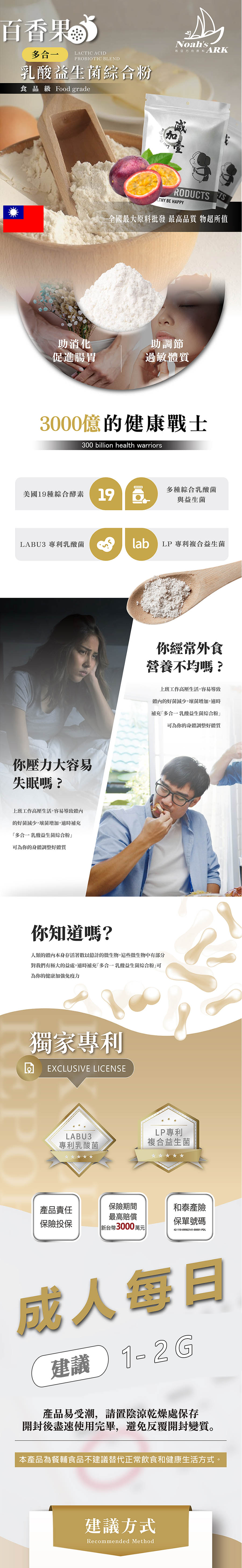 百香果果汁粉、粉微結晶狀α-纖維素、300億益生菌(植物乳桿菌、動物雙歧桿菌乳亞種BB-115、