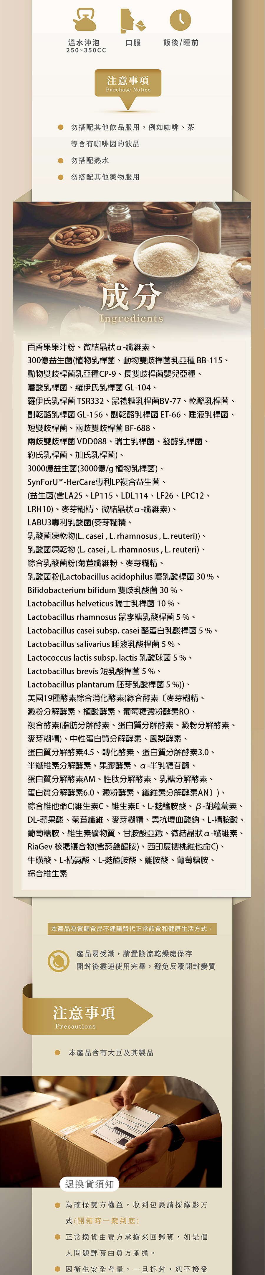益生菌(含LA25、LP115、LDL114、LF26、LPC12、LRH10)、麥芽糊精、微結晶狀α-纖維素