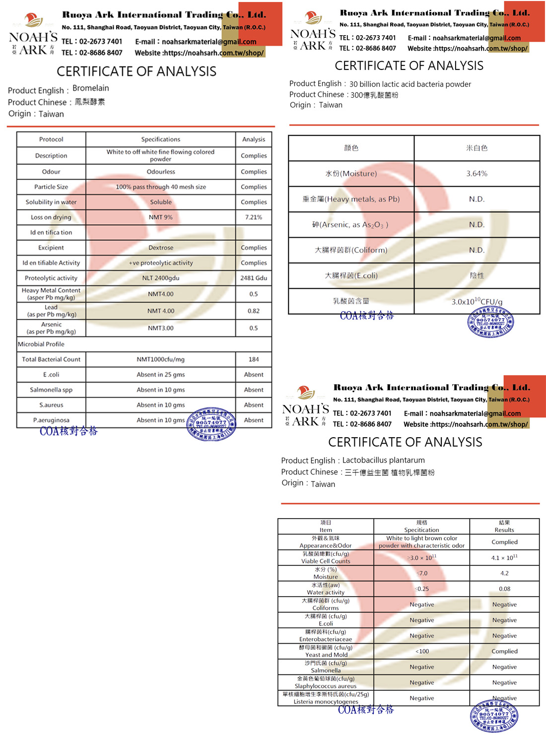 鳳梨酵素、蛋白質分解酵素4.5、轉化酵素、蛋白質分解酵素3.0、半纖維素分解酵素、果膠酵素、α-半乳糖苷酶、