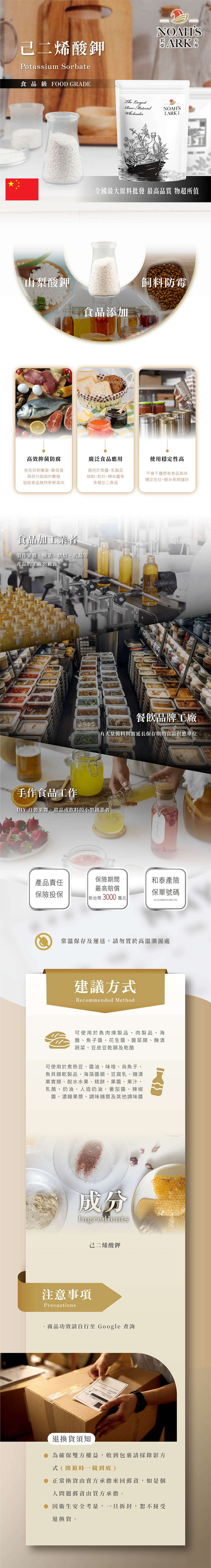 1.本品可使用於魚肉煉製品、肉製品、海膽、魚子醬、花生醬、 醬菜類、水分含量25%以上(含25%)之蘿蔔乾、醃漬蔬菜、豆皮豆乾類及乾酪;用量Sorbic Acid計為2.0g/kg以下。