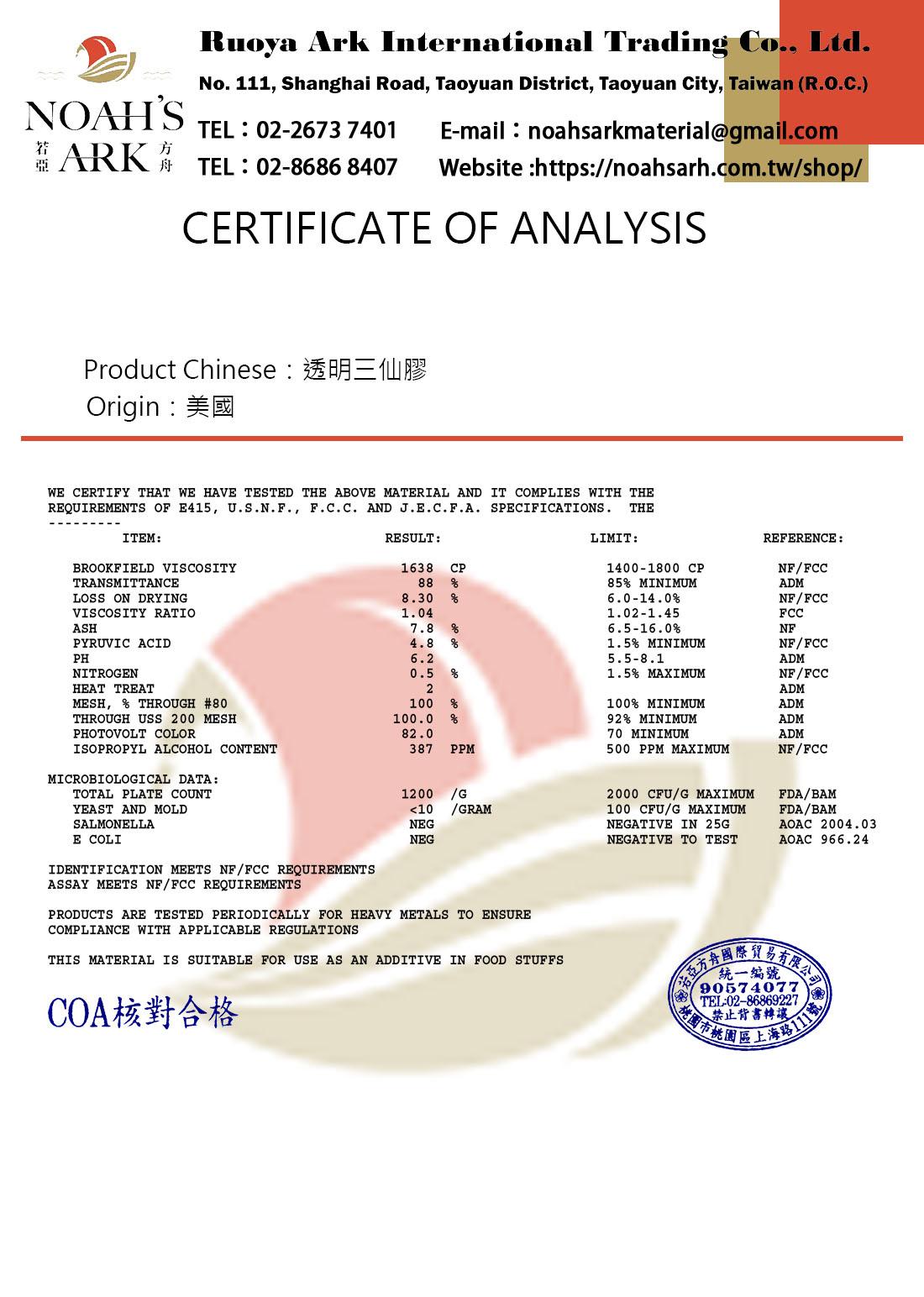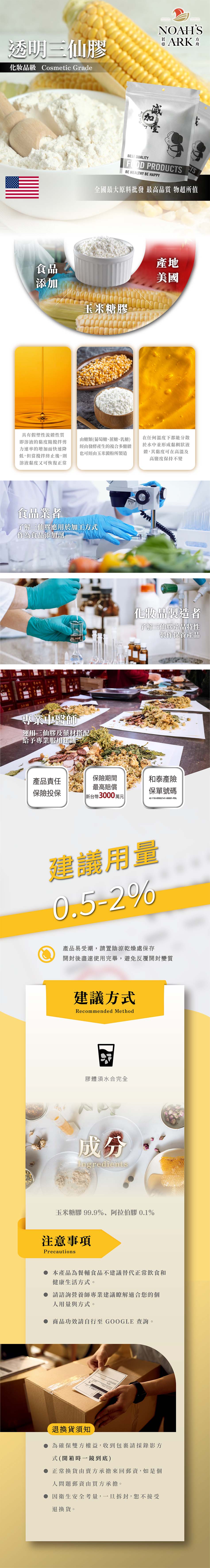 美國知名大廠製造,溶解後的稠狀液態為透明無色,適合各種食品,化妝品,加工調製。