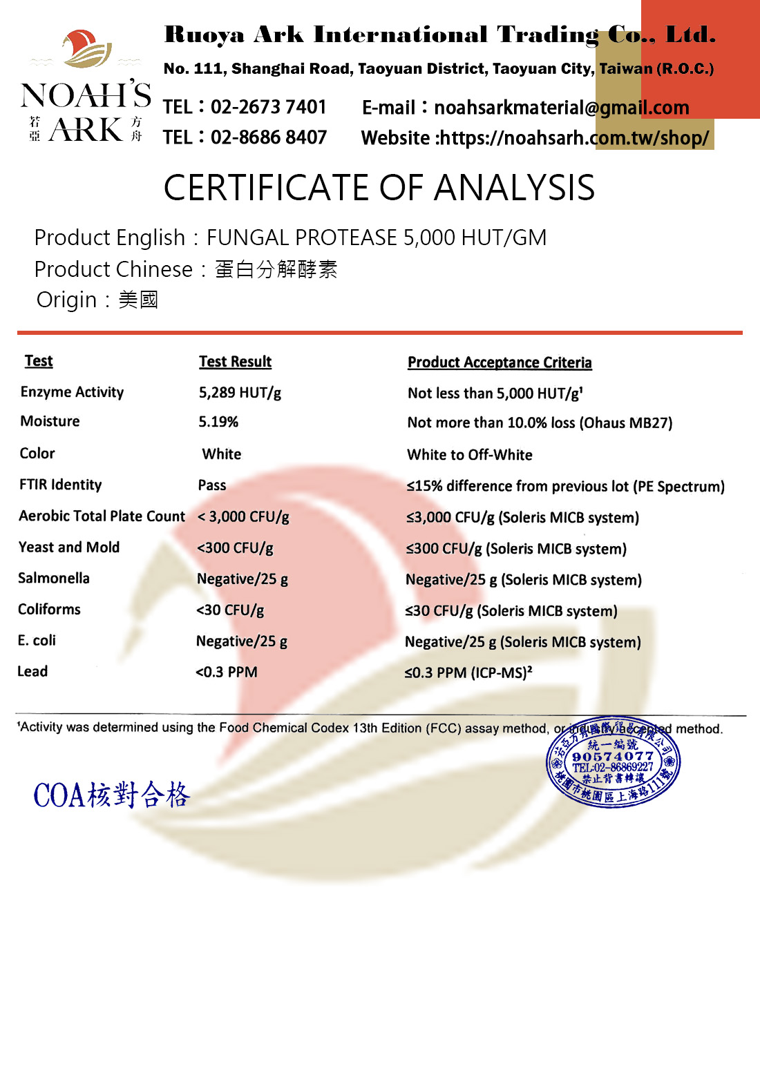 英文名:FUNGAL PROTEASE 5,000 HUT/GM
