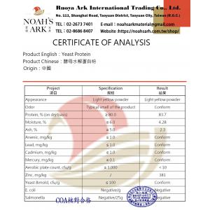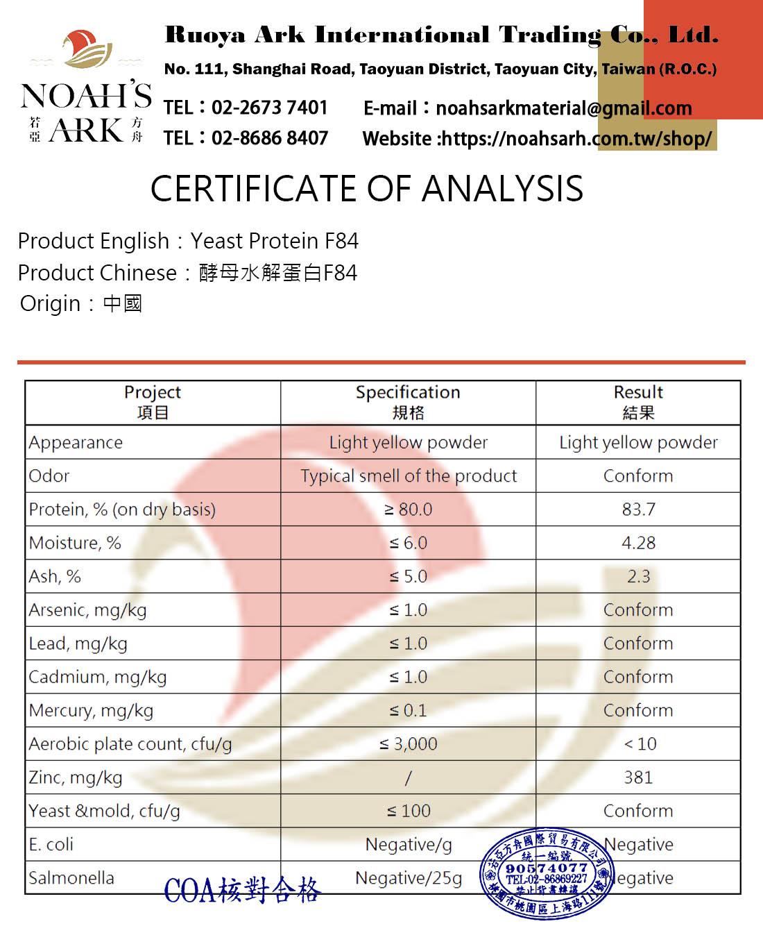 酵母水解蛋白大於82%蛋白質含量,等同於乳清蛋白的BCAA支鏈胺基酸含量≥ 22% BCAA ≥ 47.6% EAA