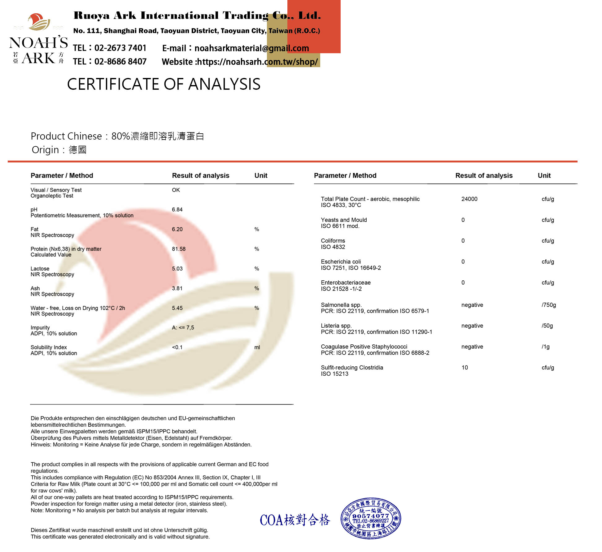 品名:80%濃縮即溶乳清蛋白-德國 (無糖原味無添加)