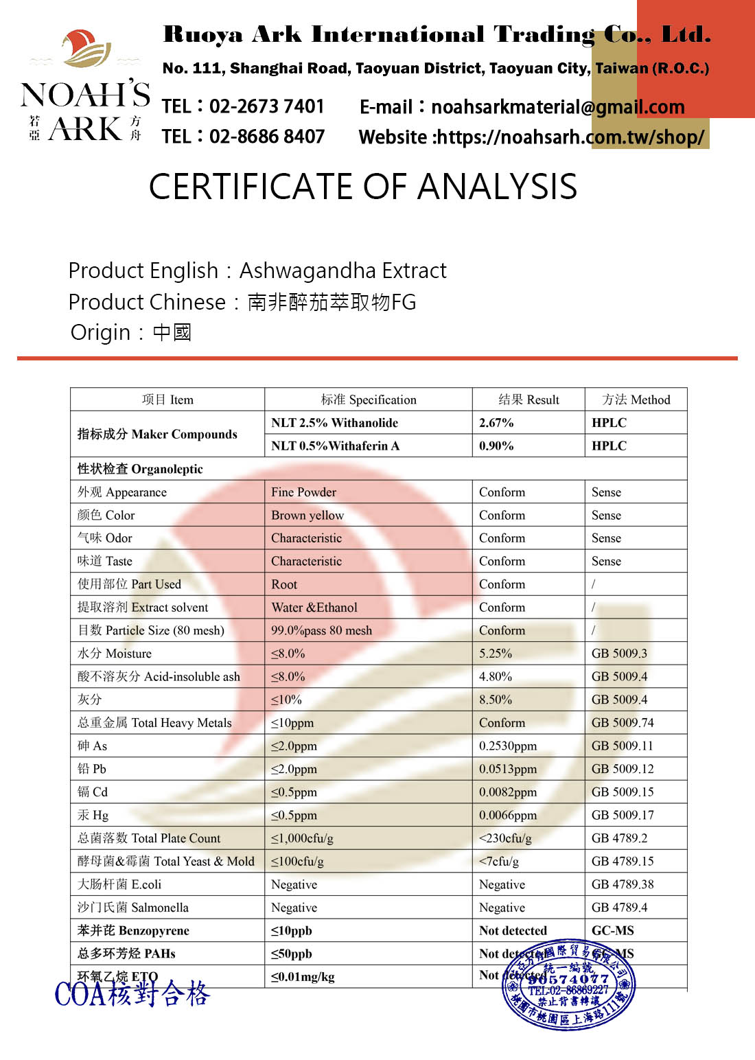 規格:總量3% (醉茄內酯2.5% 、醉茄素0.5% )