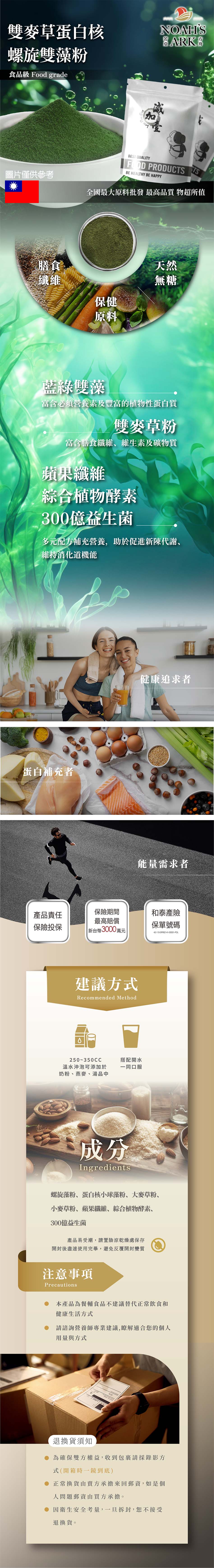成分:螺旋藻粉、蛋白核小球藻粉、大麥草粉、小麥草粉、蘋果纖維,綜合植物酵素、300億益生菌