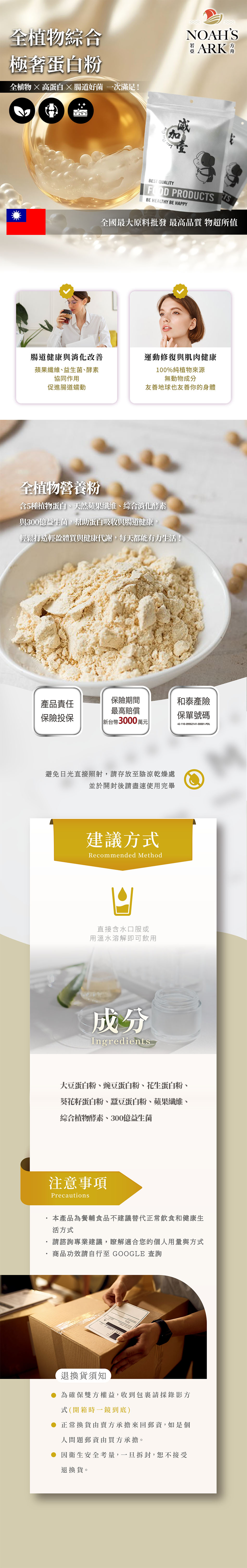 成分:大豆蛋白粉、豌豆蛋白粉、花生蛋白粉、葵花籽蛋白粉、蠶豆蛋白粉、蘋果纖維、綜合植物酵素、300億益生菌