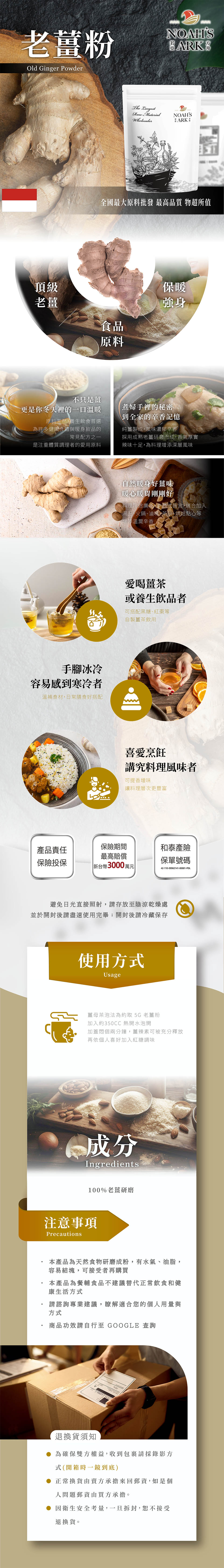 採用生長超過一年的老薑,經過老祖母的傳統方式,研磨而成老薑粉,味道更香更辣。
