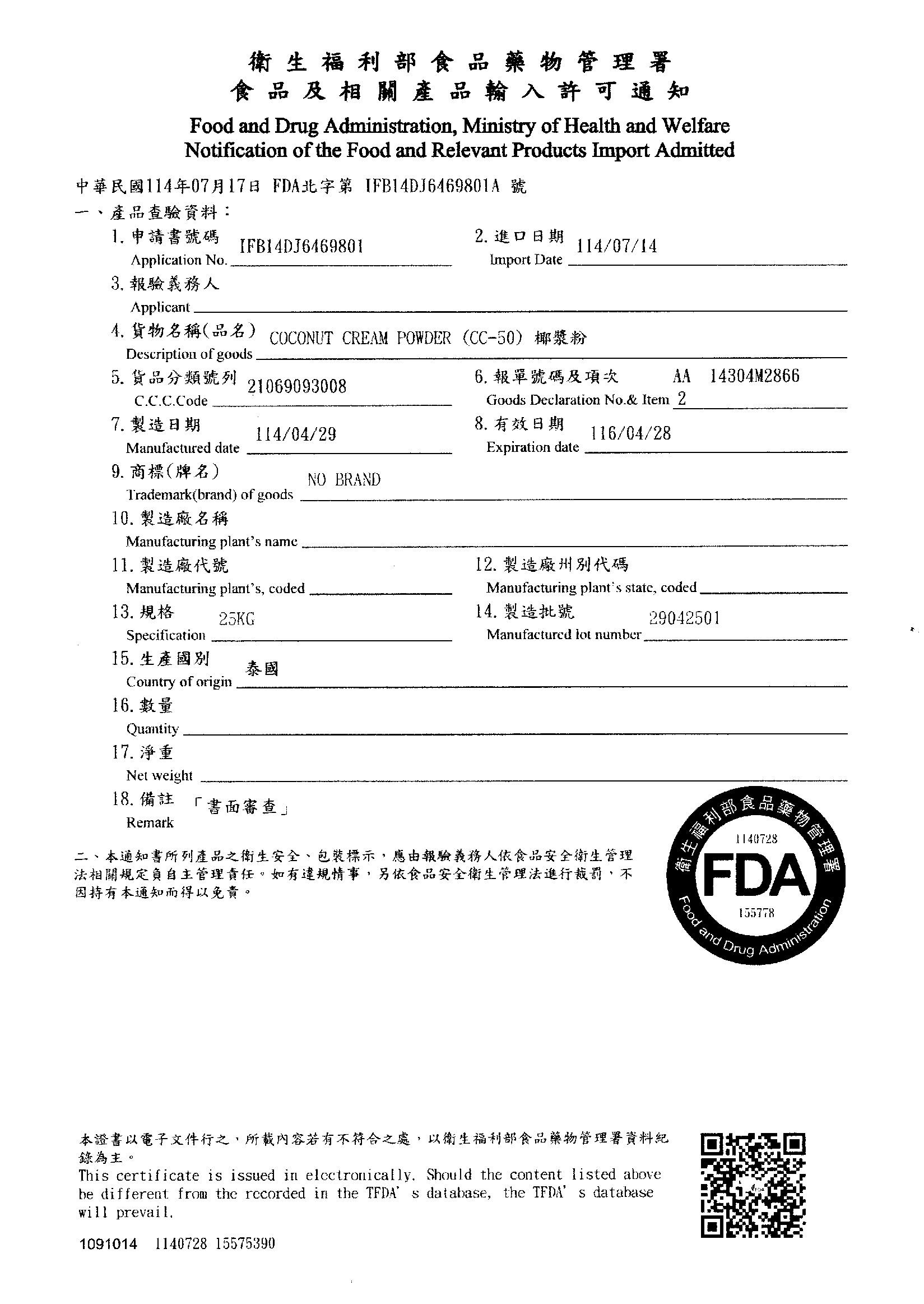使用限制:限用於食品製造貨加工時使用