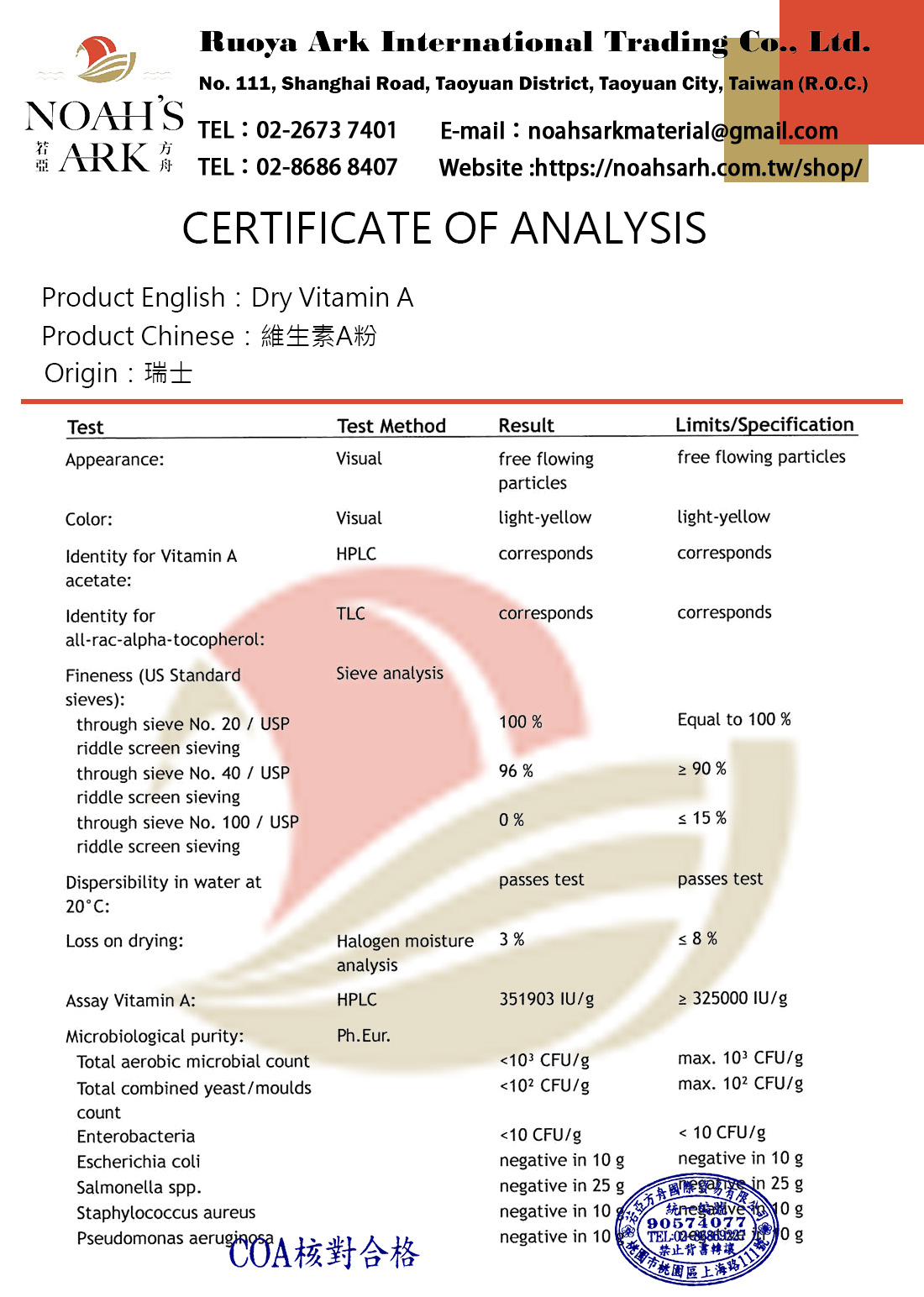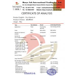 成分:乾燥葡萄糖漿、阿拉伯膠、玉米澱粉、維生素A乙酸酯11.5%(325,000IU/g)、維生素E(抗氧化劑)1.5%
